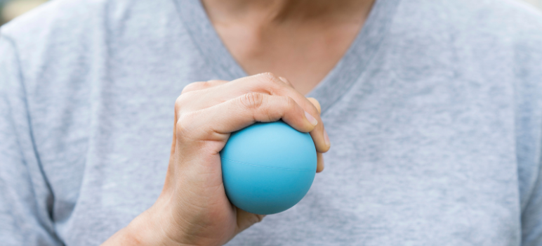 Eine Frau in einem grauen T-Shirt drückt einen blauen Stressball - sie will Erwartungen und Kontrolle loslassen.